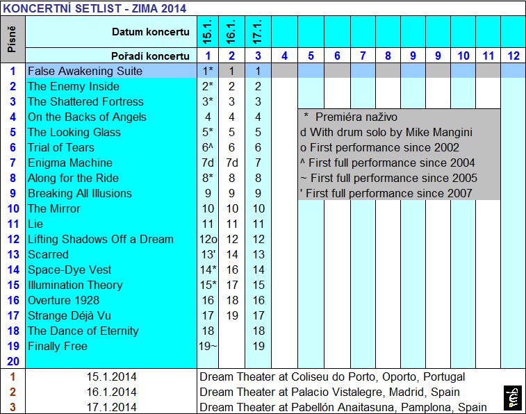 ![]() ![]() Dream Theater mají za sebou tři koncerty z turné, a tak jsou končně informace o skladbách, které lze na představení slyšet. Kromě písní z novinkové desky tam lze nalézt i několik překvapení. Skladbu "False Awakening Suite" pouštějí, jak slíbili, před jejich příchodem na jeviště - vězme, že je mnohem kratší než dříve uváděná skladba Dream Is Collapsing od Hanse Zimmera, a na pódium se tam dostanou mnohem dříve... Třeba skladba "Space-Dye Ves" má vůbec poprvé na tomto turné premiéru naživo, neboť po odchodu Kevina Moore ji nikdy nehráli. Potěšilo mě zařazení skladeb "Mirror" a "Lie" z jejich skvělé desky "Awake", které představují to nejlepší z jejich tvorby. Některé skladby nehráli strašně dlouho, "Lifting Shadows Off a Dream" hrají poprvé od roku 2002, "Trial of Tears" od roku 2004, "Finally Free" od roku 2005 a skladbu "Scarred" hrají poprvé od roku 2007. Takže se máme v Praze opravdu na co těšit. Foto Johna Petrucciho vlevo je z konceru v Pabellón Anaitasuna, Pamplona, ve Španělsku. [Zapsáno: 18. 1. 2014] |