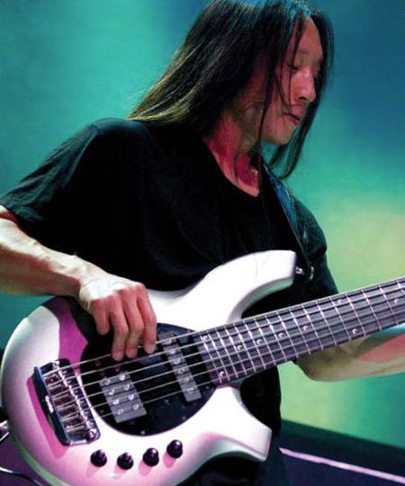 John Myung s jednou ze svých Music Man Bongo - 6-strunnou basou. |